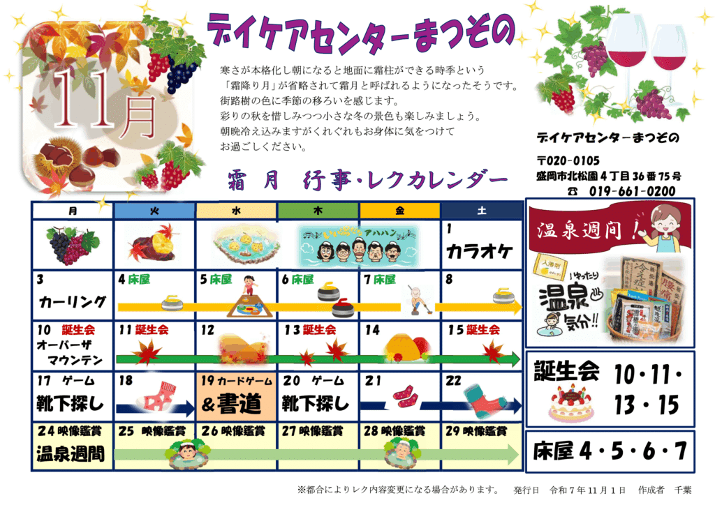 デイケアセンターまつぞの〒020‐0105盛岡市北松園4丁目36番75号TEL 019-661-0200 担当 渋谷FAX 019-661-2090